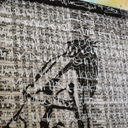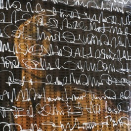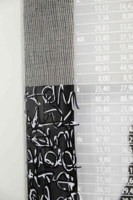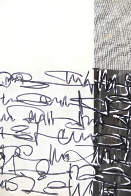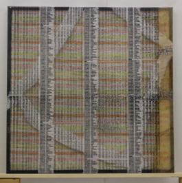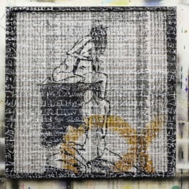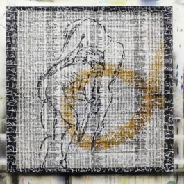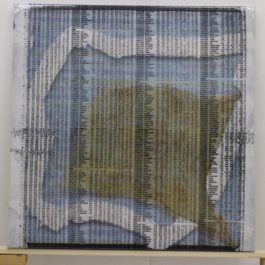 Präparierte Gaze, Farbe, Serigrafie, Farbstift auf 3 Ebenen.