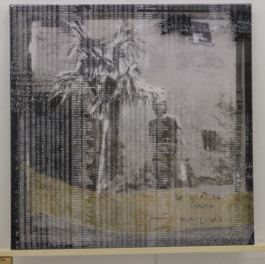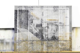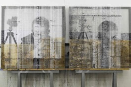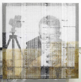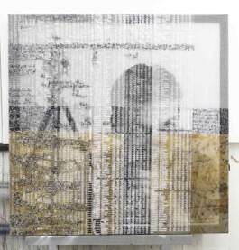 Siebdruck, Farbstift, Foto, präparierte Gaze auf drei Ebenen.